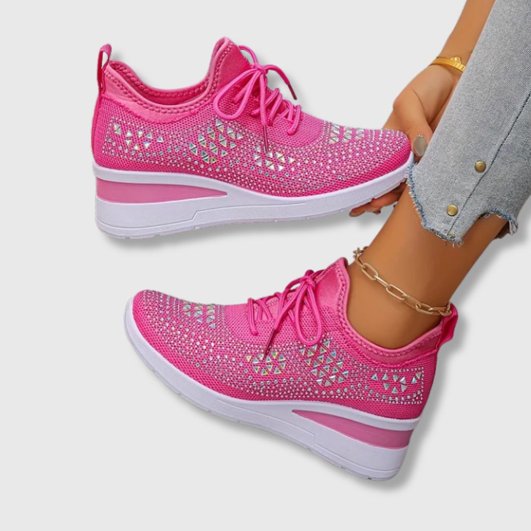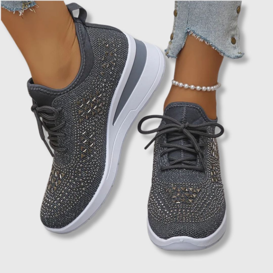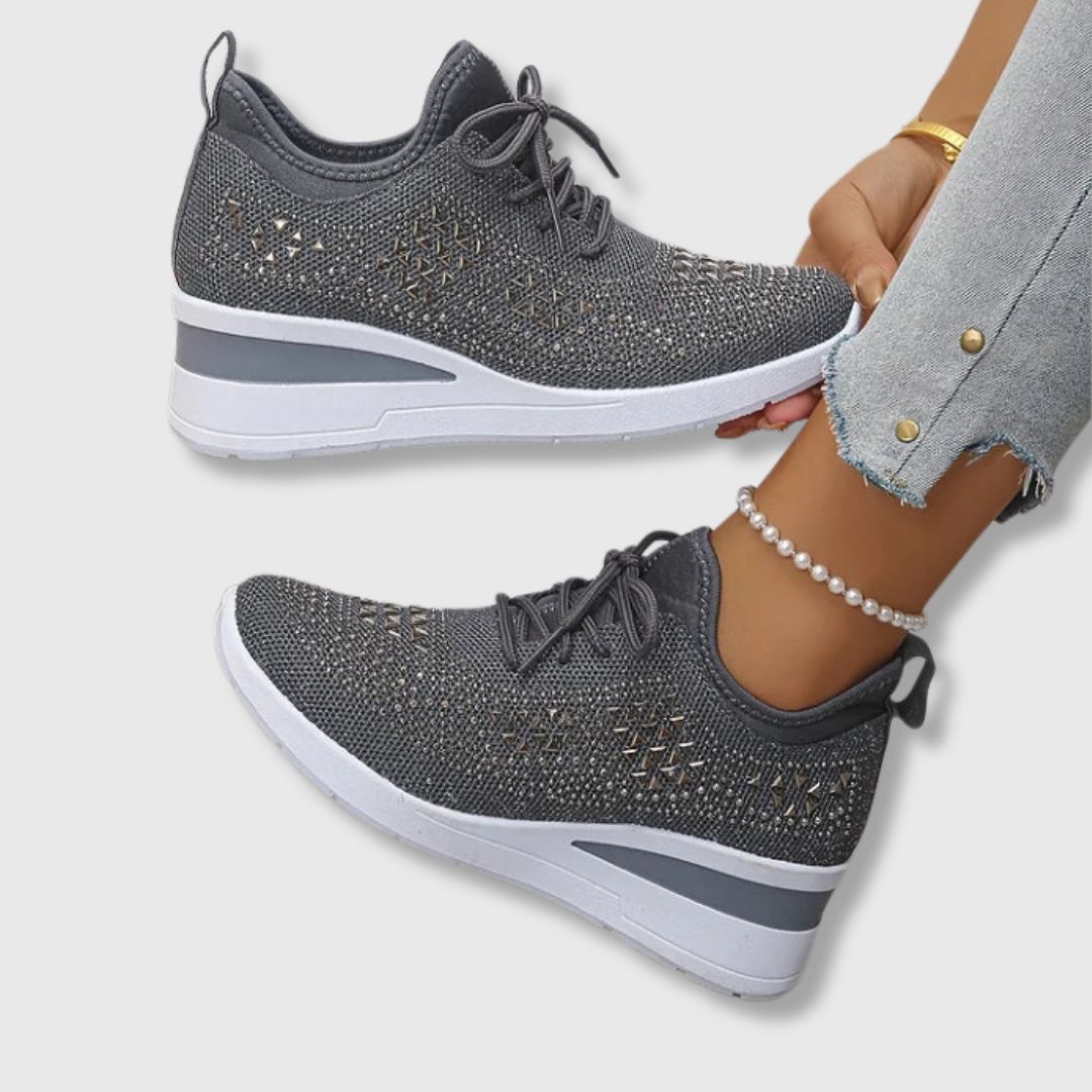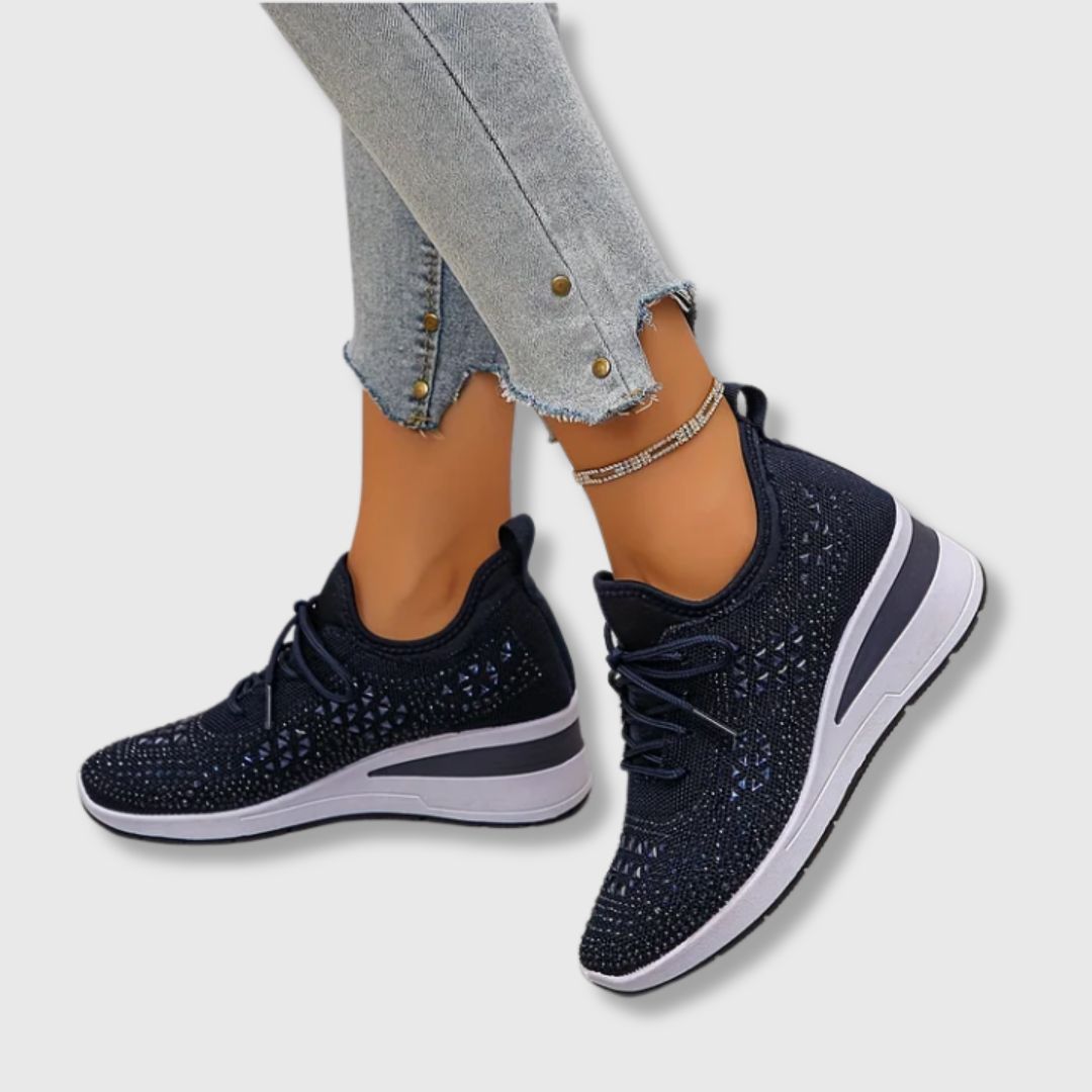 - Dizájn: légáteresztő szövött felsőrész, finoman megemelt sarok, párnázott talp boltozati támaszszal, visszafogott csillogó részlet