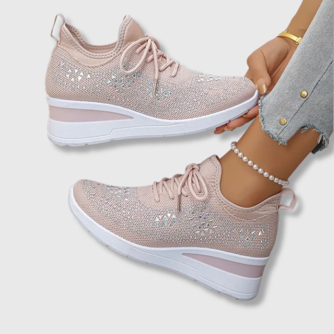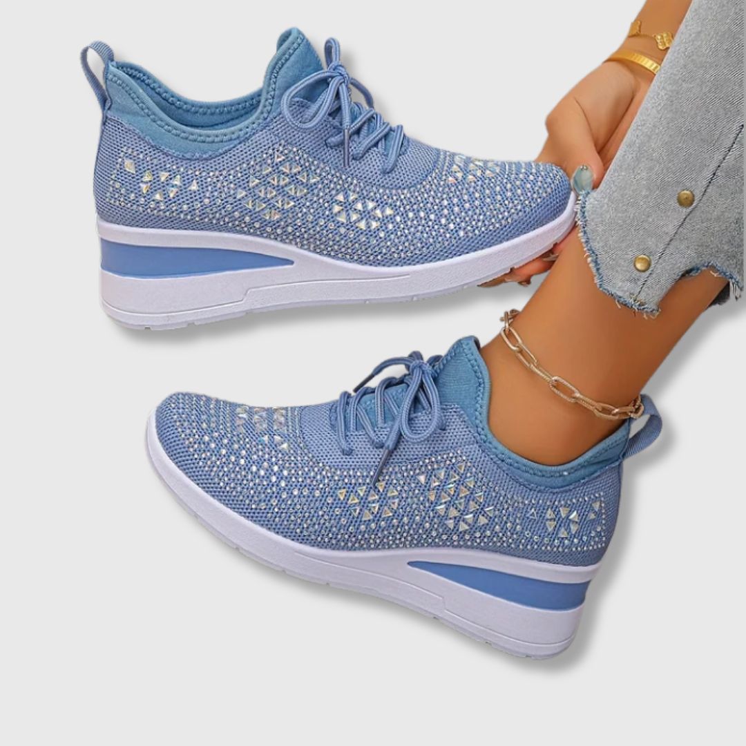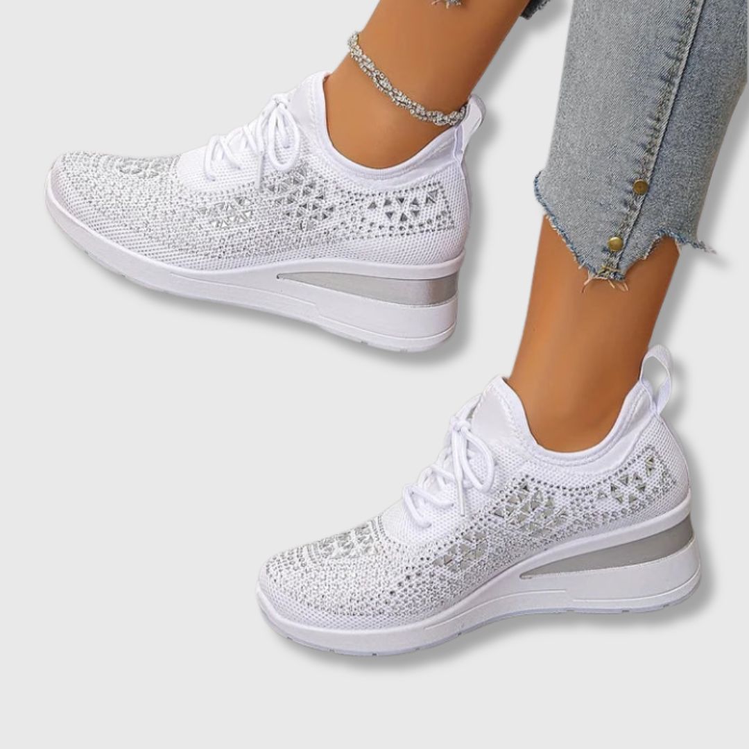 - Dizájn: légáteresztő szövött felsőrész, finoman megemelt sarok, párnázott talp boltozati támaszszal, visszafogott csillogó részlet