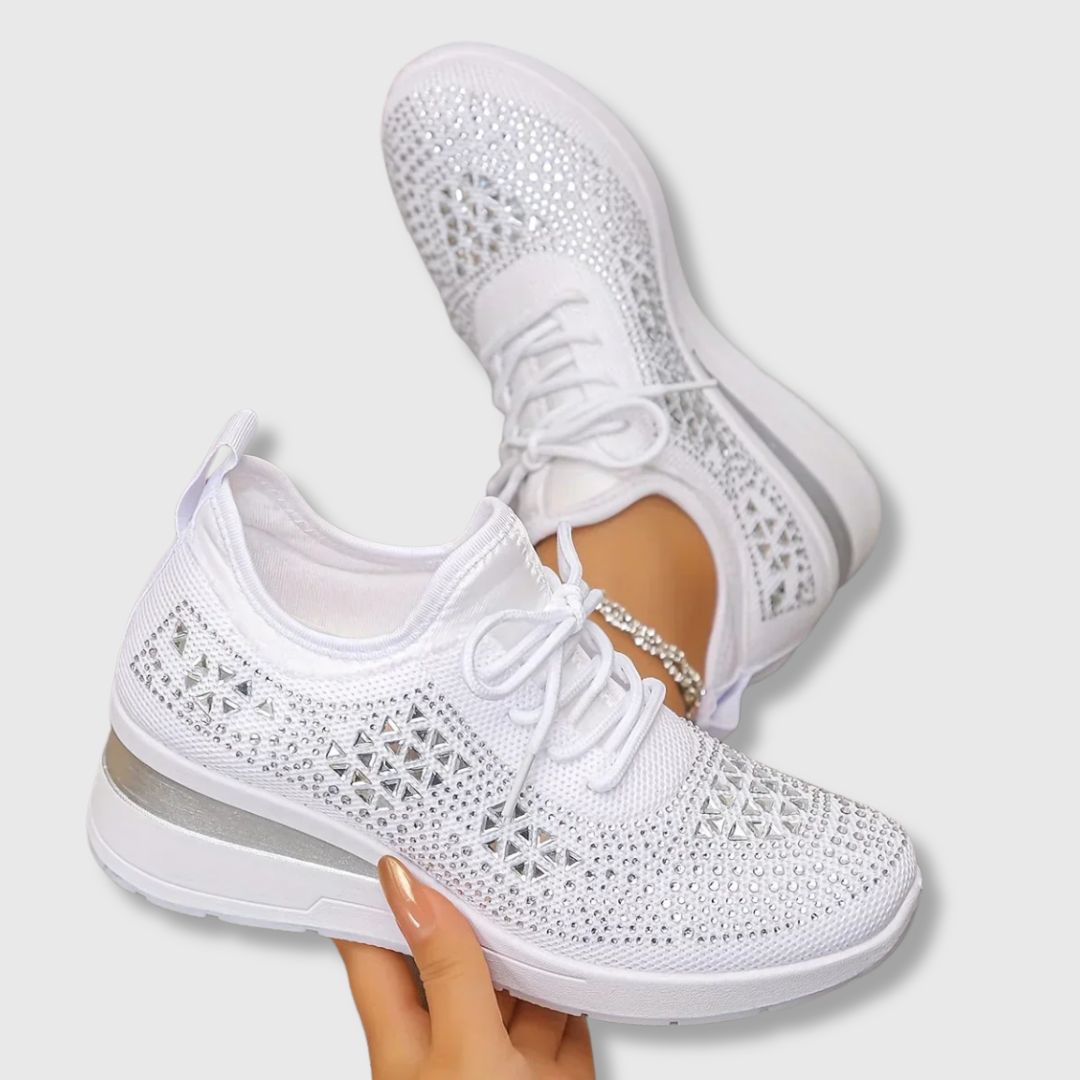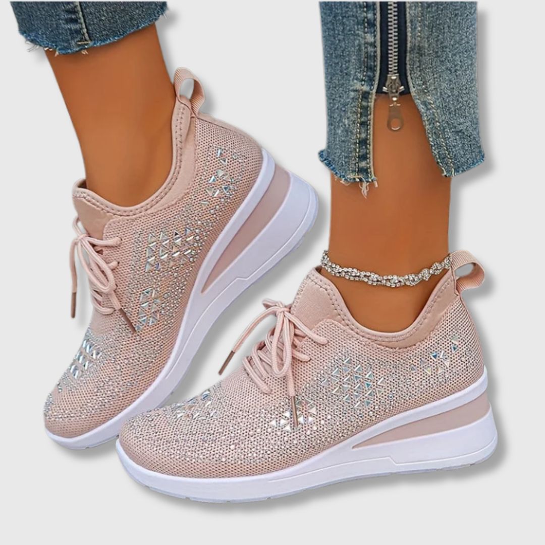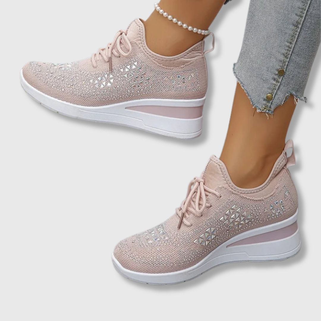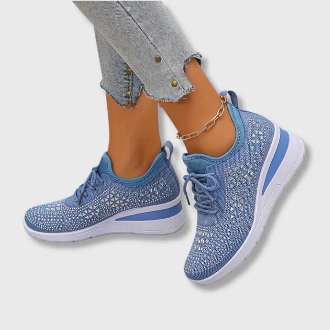- Dizájn: légáteresztő szövött felsőrész, finoman megemelt sarok, párnázott talp boltozati támaszszal, visszafogott csillogó részlet
